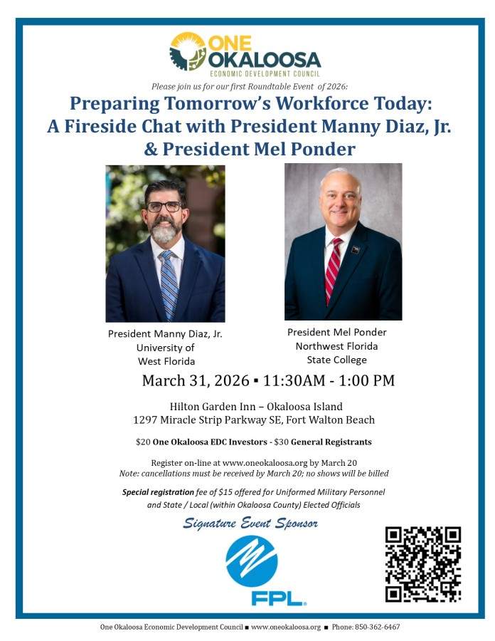 On September 4, 2025, One Okaloosa EDC was proud to host a Roundtable Luncheon featuring Florida Secretary of Commerce J. Alex Kelly. Secretary Kelly's insightful presentation spotlighted recent successes and economic metrics. Northwest Florida State College served as the Signature Event Sponsor for the luncheon, which was attended by more than 170 community leaders.